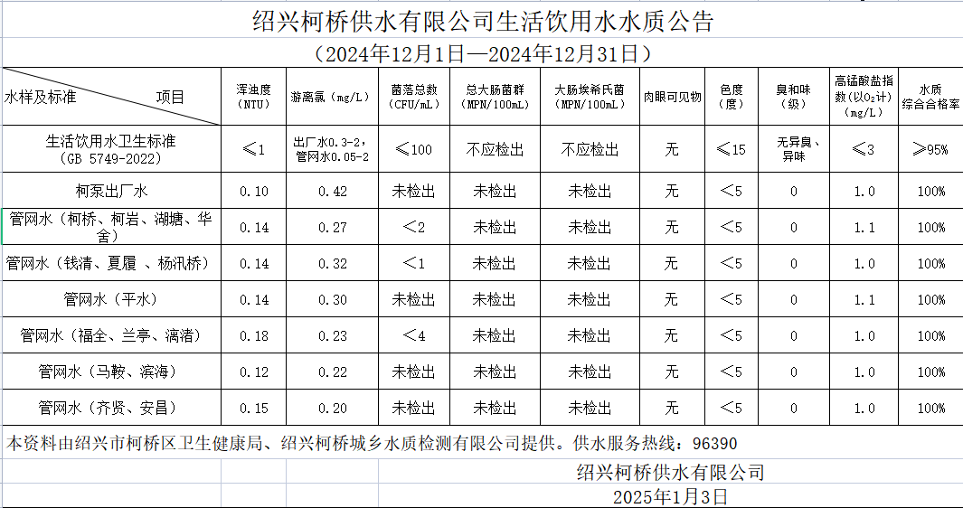 生活飲用水水質(zhì)公告(2024年12月1日—2024年12月31日)