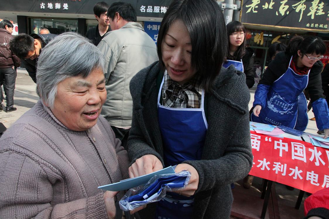 圖為工作人員向過往的居民宣傳節(jié)水、護(hù)水知識(shí)