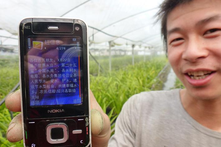圖為農(nóng)民朋友正在查看通過“農(nóng)民信箱”發(fā)送過來(lái)的節(jié)水知識(shí)短信